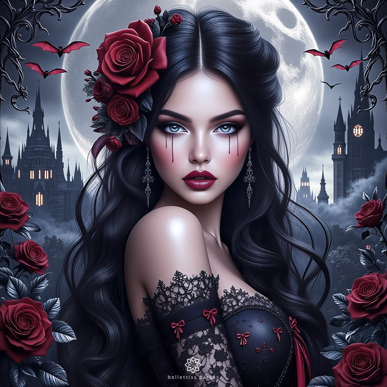 In the quiet space between midnight and dawn, beauty finds its most striking expression. This piece captures the delicate balance of gothic romance, where sorrow and strength intertwine. The bold contrast of crimson roses against a full moon evokes a sense of timeless, haunting elegance. It invites us to find power in vulnerability and artistry in the shadows. Explore the depths of dark fantasy and let your imagination wander these moonlit castle grounds.